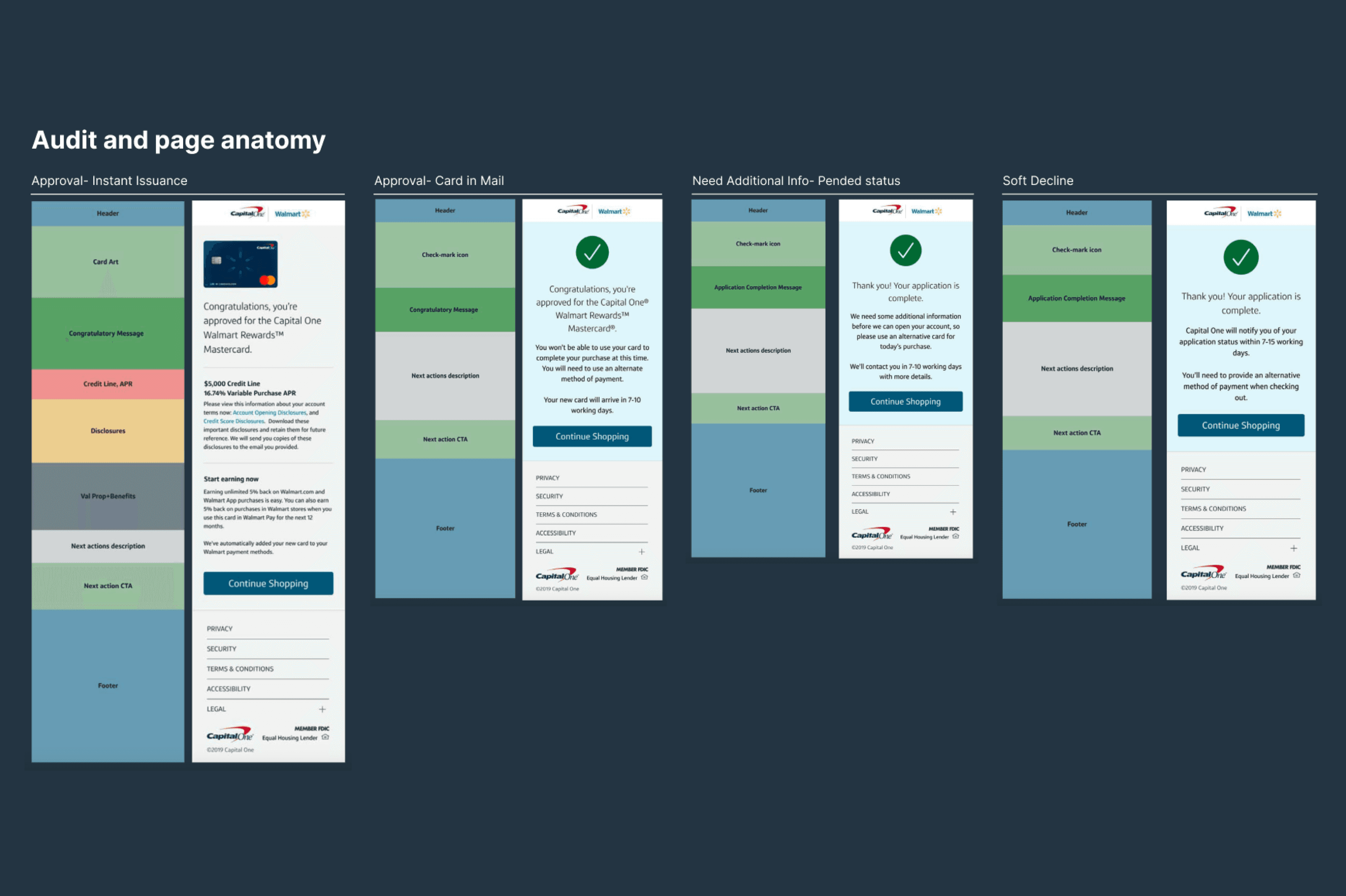 Wireframes and content variations were developed for each application outcome and channel, then reviewed with Product Managers to gather feedback and drive iterative improvements to layout and messaging.