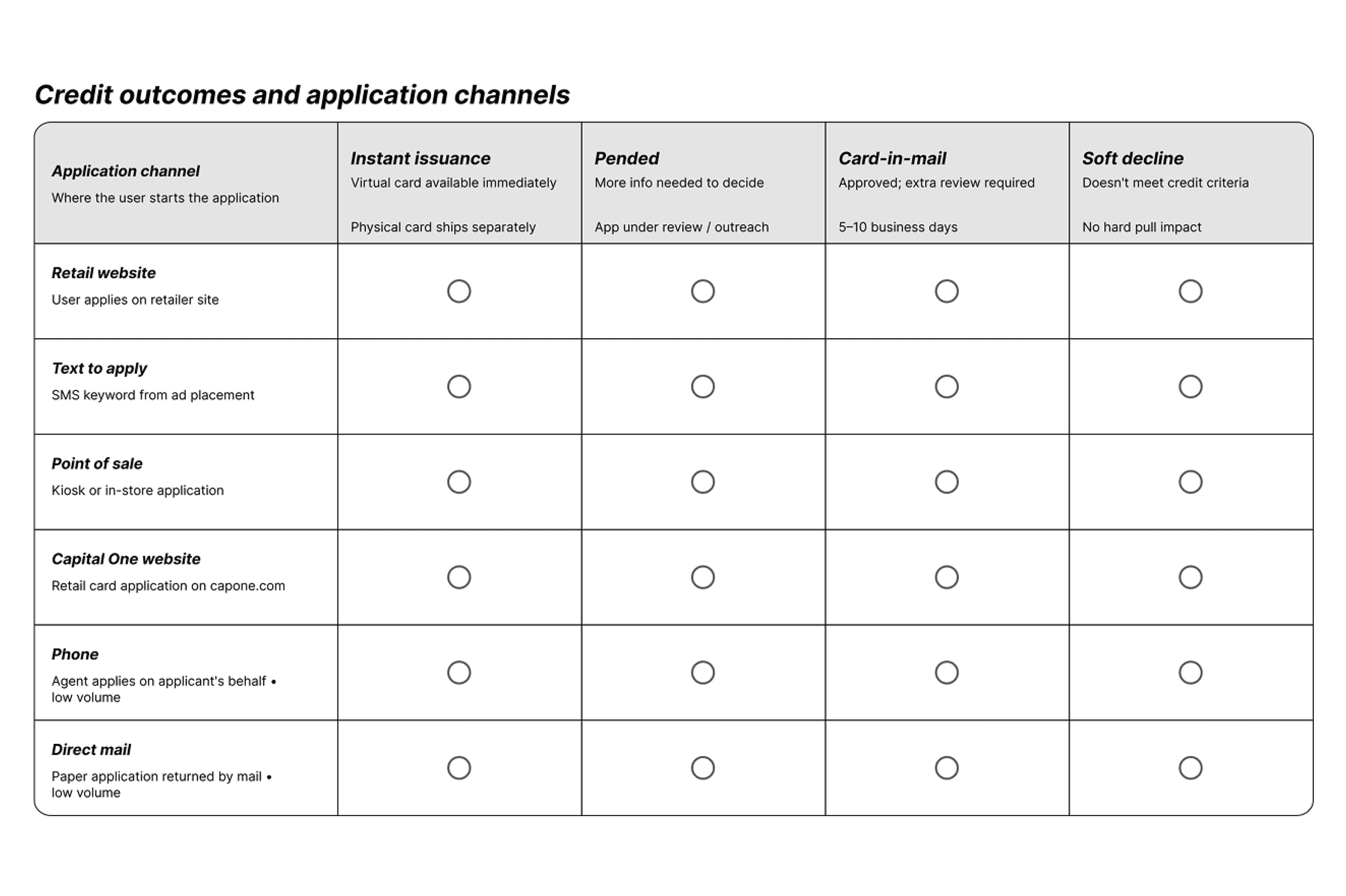 Meetings with the product team helped identify all possible application outcomes and channels and define requirements for each.