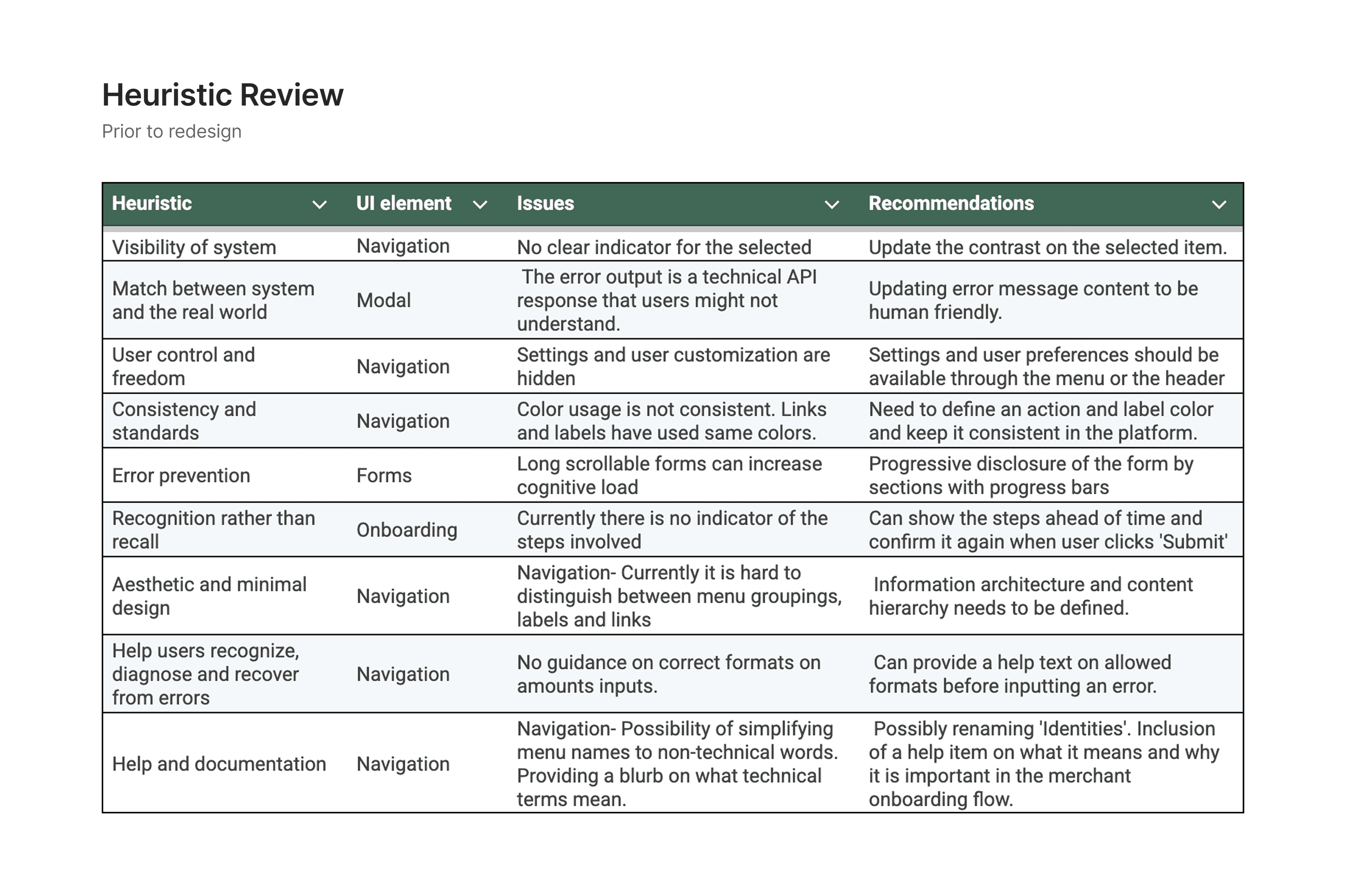 Product teams requested a full heuristic review of the entire platform to identify usability issues and improvement opportunities. I conducted the review and presented findings to Product Managers to establish alignment on UX priorities and define focused areas for strategic design improvements.